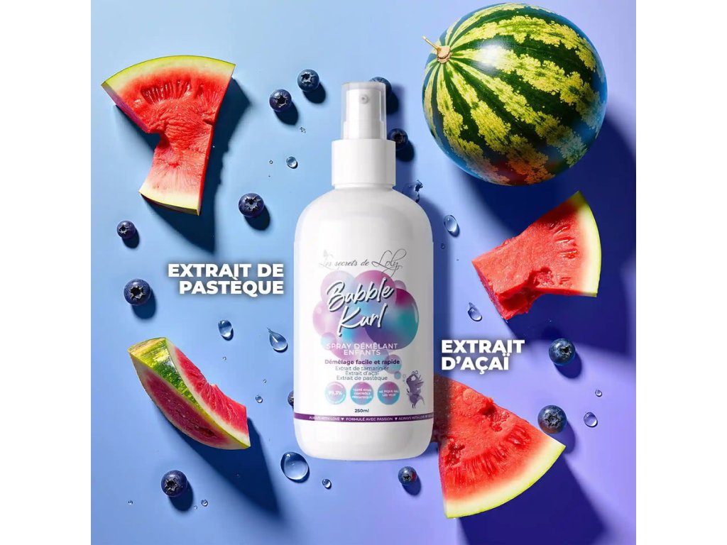Les Secrets de Loly rozčesávací sprej Bubble Kurl, který spojuje péči a potěšení! Sbohem slzám a zacuchaným vlasům, ahoj jemné, lehké a pružné kudrny! Speciálně vyvinutý pro děti a s ohledem na citlivou pokožku hlavy, je tento lehký sprej obohacený o přírodní výtažky z tamarindu, plodů acai a vodní melounové vody. Hydratuje a vrací pružnost a lesk i těm nejzamotanějším kudrnám. Jediným pohybem jemně rozčesává bez zatížení, snižuje krepatění, posiluje vlasová vlákna a probouzí přirozený lesk vlasů. Díky lehké textuře je ideálním pomocníkem pro všechny typy kudrnatých vlasů, i ty nejjemnější. A jako třešnička na dortu – jeho neodolatelná vůně bubble gum okouzlí malé i velké, proměňující každou péči o vlasy ve sladký a hravý okamžik. Tento rozčesávací sprej je vyroben z 99,3 % složek přírodního původu.