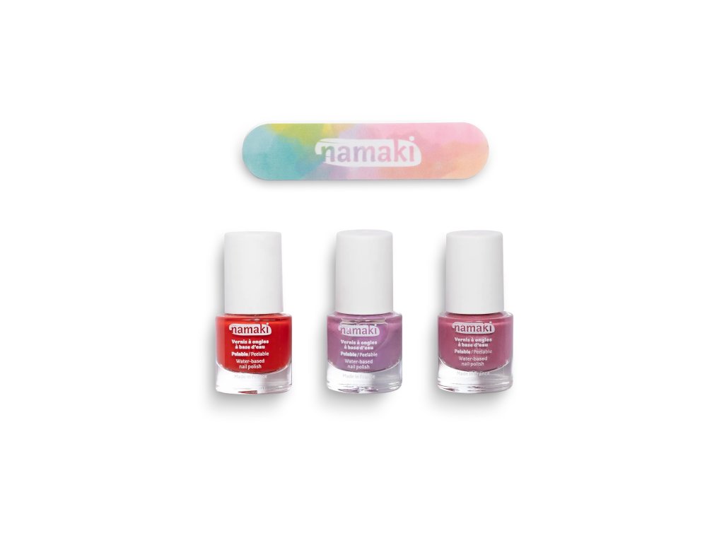 Namaki dětské laky na nehty 3 ks (višňová, fialová, třpytivě růžová) + pilníček