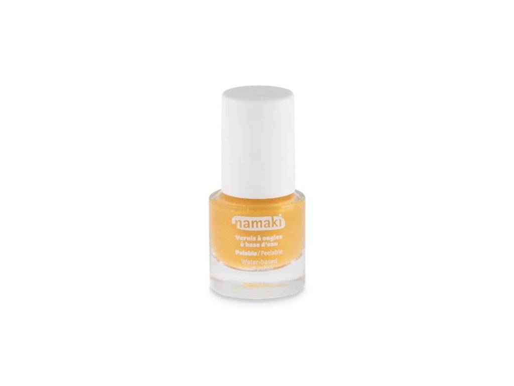 Namaki dětský lak na nehty v barvě Gold. Snadná aplikace: malý štěteček je speciálně navržený pro dětské nehty. Rychleschnoucí: během pár minut mohou děti pokračovat ve svých hrách. Odolné proti vodě: na rozdíl od některých vodou ředitelných laků naše formule odolává mytí rukou i kontaktu s ústy. Olupovací: žádný odlakovač není potřeba – lak se snadno odstraní jako samolepka. Přátelský k dětem: vodou ředitelná formule neobsahuje škodlivé látky jako parabeny, formaldehyd, ftaláty, toluen a kafr. Neobsahuje ani rozpouštědla ani nepříjemné vůně.