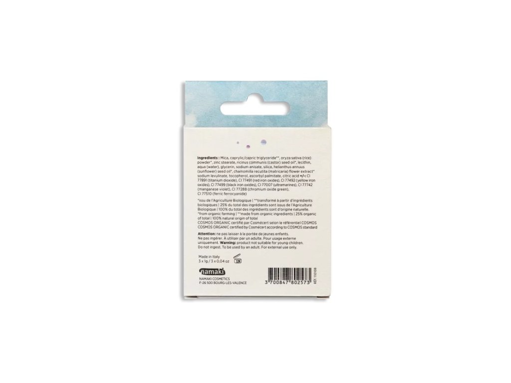 Ponořte se do kouzla zimy s paletou Namaki! Třpytivé odlesky a sníh. Naše oční stíny v zimích barvách vás přenesou do magického světa. Míchejte je, vrstvěte a vytvářejte barevné přechody, které odráží nádheru této sezóny. Příjemná aplikace: oboustranný aplikátor zajišťuje jemný pocit na víčkách. Snadné odstranění: jednoduše mýdlem a vodou. Šetrné k pokožce: přírodní složení, dermatologicky testováno, certifikace Cosmos Organic – použití bez rizika. Zábavné a praktické: paleta obsahuje zrcátko a snadno se přenáší kamkoli. Ekologické: obal je ekologicky navržený a recyklovatelný. Objevte kouzlo přírody a nechte své oči zazářit s Namaki!
