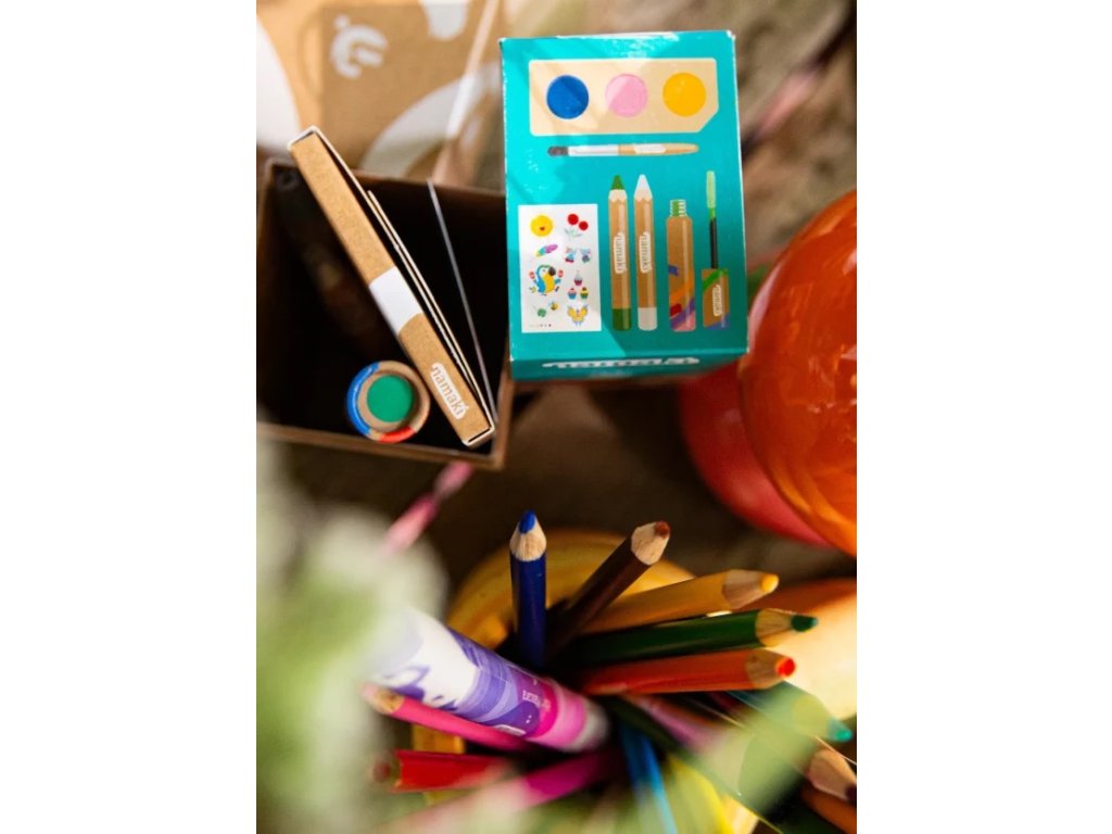 Připravte se okouzlit kouzlem Rainbow Namaki Boxu! Vydejte se do slavnostního světa, kde se barvy stávají vašimi nejoblíbenějšími hračkami. Tato krabička obsahuje poklady duhy, připravené proměnit váš den v barevné dobrodružství. Vše v jednom: základní potřeby pro klaunský převlek v jediné krabičce pro vytvoření kompletního kostýmu, včetně 3krokového návodu. Praktické a snadné použití: ideální jako dárek. Šetrné ke zdraví: přírodní složení, certifikace Cosmos Organic (*tetování vyjma). Ekologický závazek: ekologicky navržená krabička, opakovaně použitelná a snadno přenosná.