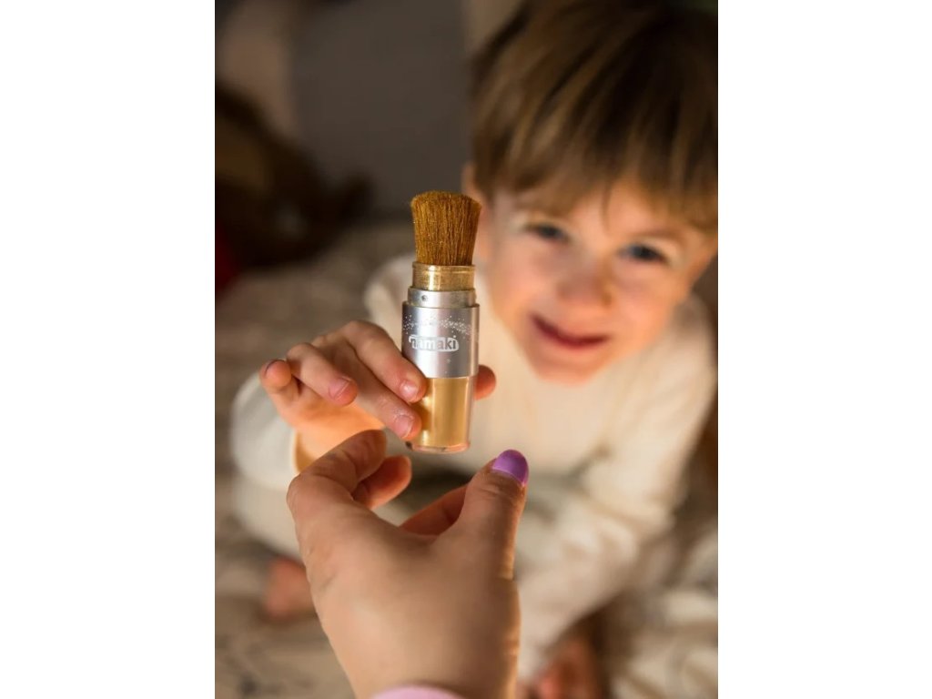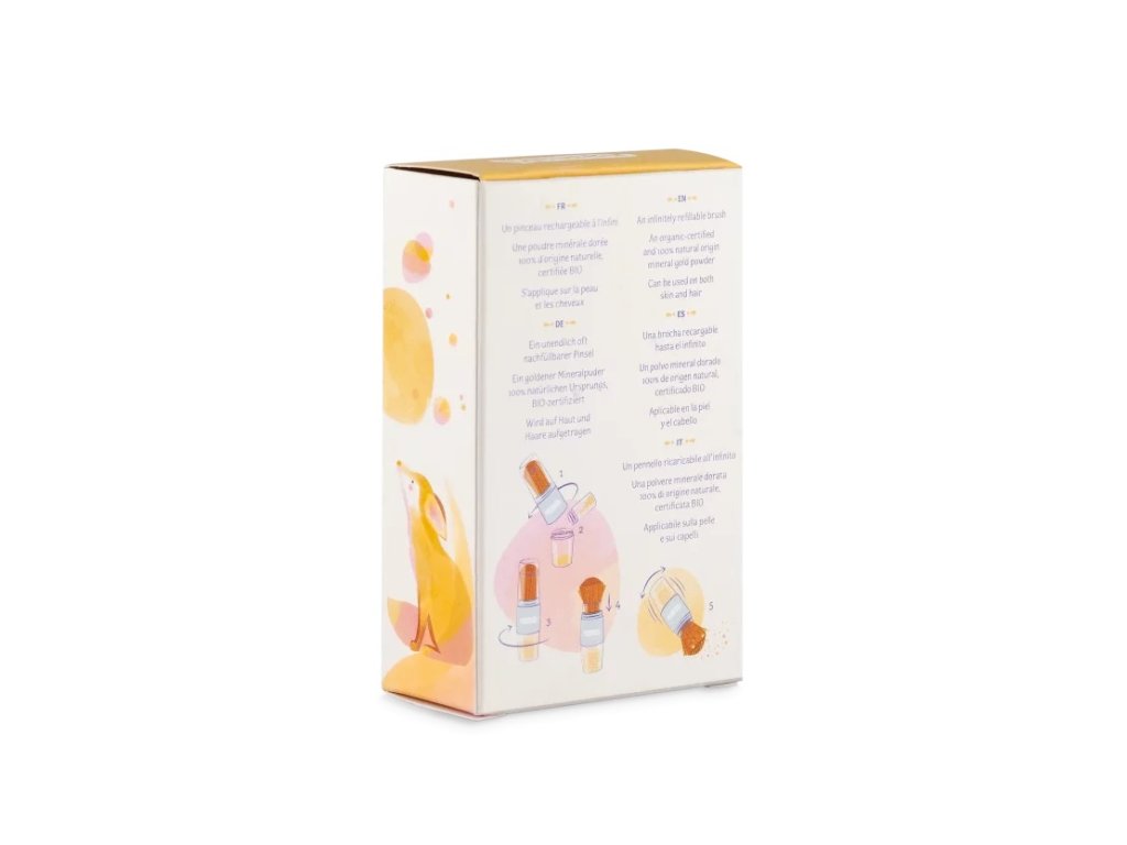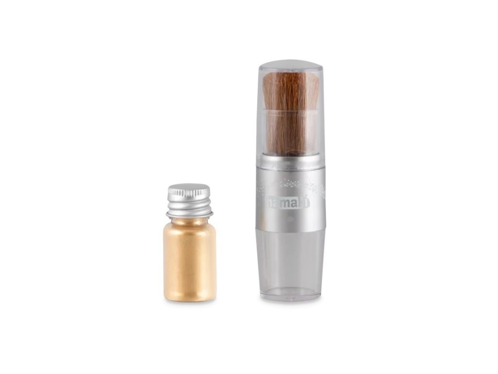 Třpytivý pudr Namaki pro rozjasnění pleti a vlasů ve zlaté barvě. Díky magickému, doplňovatelnému štětci se pudr nanáší tak jemně, jako byste se dotýkali pokožky pohlazením. Jednoduchý dotek na kůži nebo vlasy vytvoří zlatavé odlesky. Ekologický. Třpyt vzniká z přírodních minerálních složek. Snadná aplikace: přírodní štětiny štětce zajišťují jemné a měkké nanášení. Šetrné k pokožce: pudr je 100% přírodní, minerální, dermatologicky testovaný, s certifikací Cosmos Organic – bezpečné použití. Ekologické: štětec je nekonečně doplňovatelný. Bonus: lze aplikovat na kůži i vlasy.
