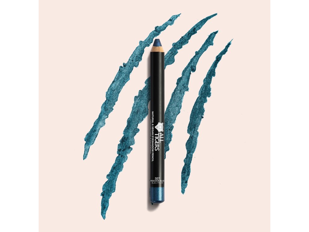 All Tigers tužka a stíny v třpytivé modré. Můžete ji aplikovat jako stíny nebo jako tužku. Perfektně drží. Obsahuje organický kokosový olej, vitamín E, karnaubský vosk a rýžový extrakt. Veganská. Dřevo je z udržitelně obhospodařovaných lesů zdobené lakem na vodní bázi. Víčko je z bio plastu.