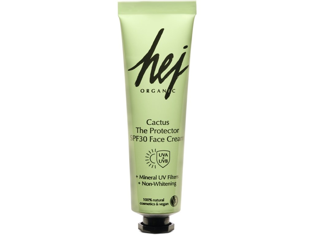 Hej Organic ochranný a vyživující krém s SPF 30 je lehký, ale výživný. Má minerální filtr (oxid titaničitý a zinečnatý), ale nezanechává bílý film a na pleti nelepí. Obsahuje vitamín C a kyselinu hyaluronovou, které pokožku chrání a dodávají ji hydrataci. Krém je vhodný i na citlivou pokožku. Zabraňuje předčasnému stárnutí pleti a dá se kombinovat se všemi produkty Hej Organic. Zelené produkty Hej Organic obsahují olej z opuncie (kaktusu), který je jedním z nejvzácnějších a nejluxusnějších přírodních olejů, které se v kosmetice používají. Vegan.